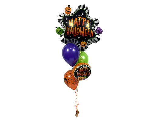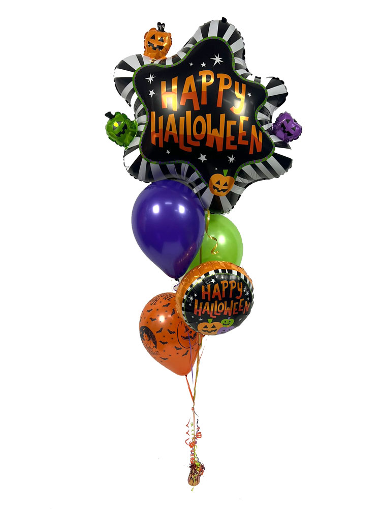 Groot ballonboeket bestaande uit een grote folie-shape met Happy Halloween en een kleine 18 inch folieballon met Happy Halloween. Daarbij nog 3 latex heliumballonnen.